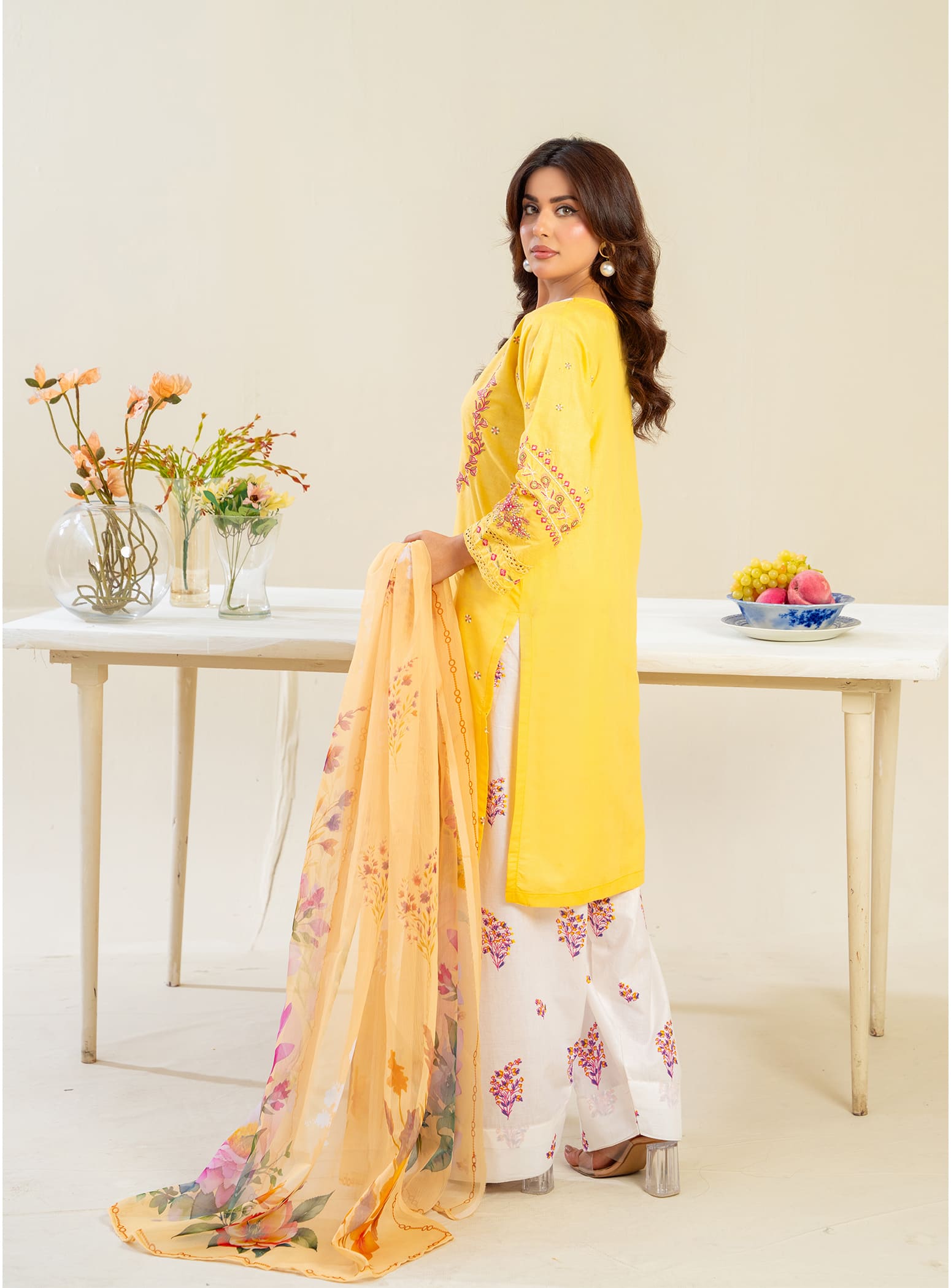 This elegant outfit features a short embroidered kurta in soft cotton, paired with a stylish farshi shalwar for a traditional yet trendy touch. The look is completed with a light chiffon dupatta, making it a perfect blend of comfort and grace. Ideal for casual wear and summer gatherings, this ensemble adds a pop of color to your everyday style.
