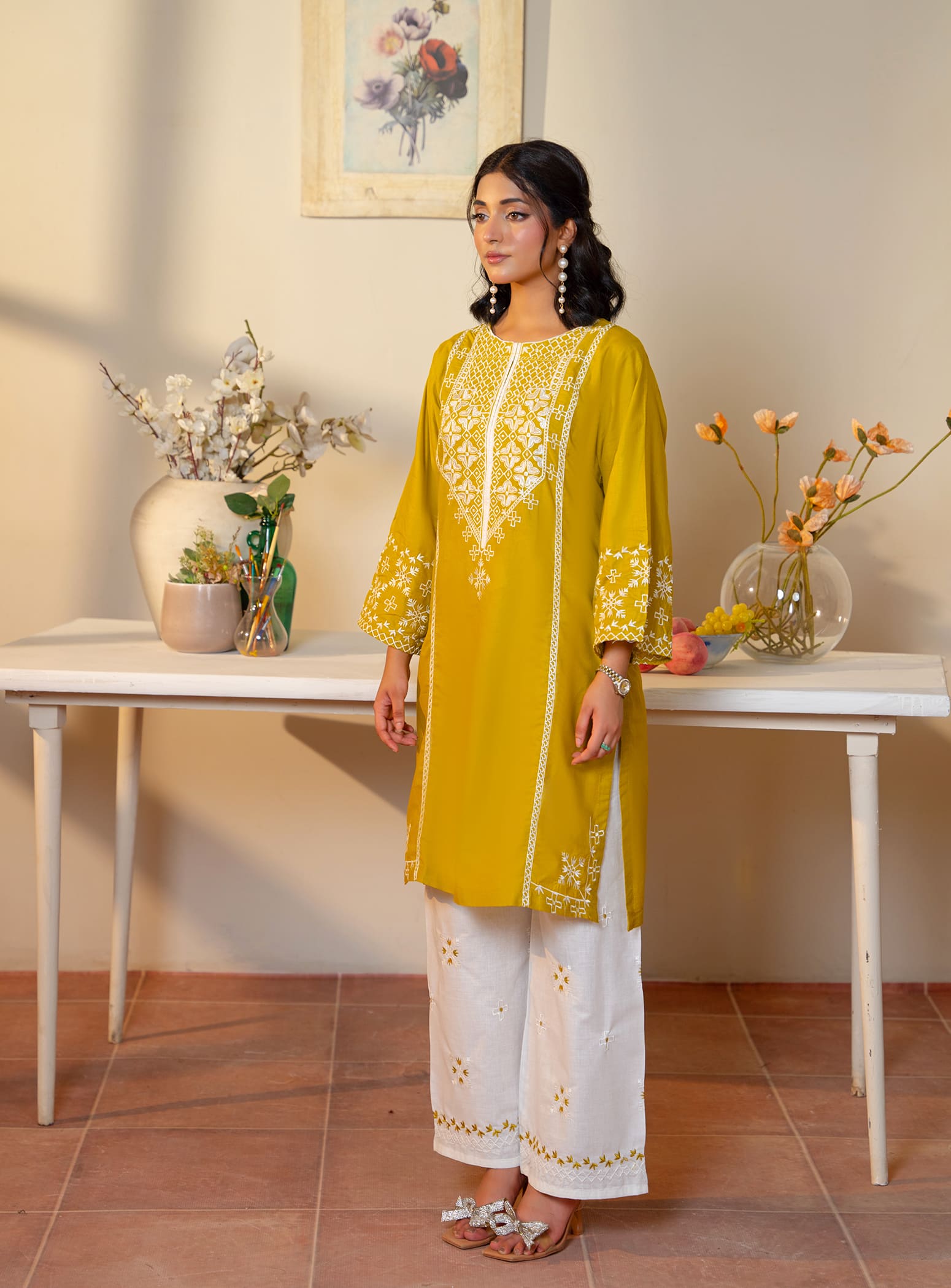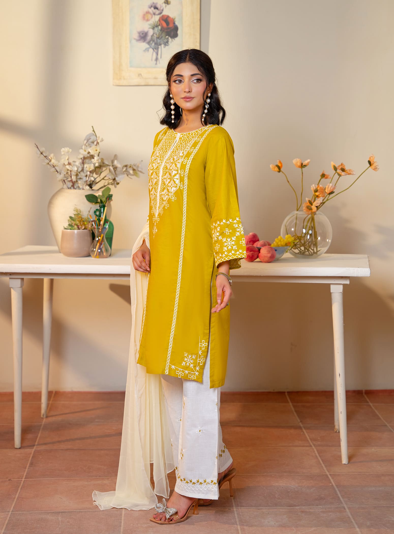 Made from breathable cotton fabric, this set includes a beautifully embroidered long kurta, paired with a comfortable straight trouser and a soft matching dupatta. Designed with an attached lining for a polished look, this outfit is perfect for daily summer wear – chic, light, and elegant.